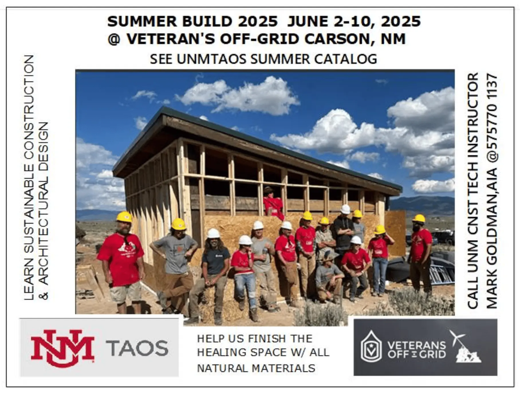 Join UNM Taos for the Summer Build 2025 at Veteran’s Off-Grid in Carson, NM! This hands-on workshop focuses on sustainable construction and architectural design, using all natural materials to help finish a healing space for veterans.