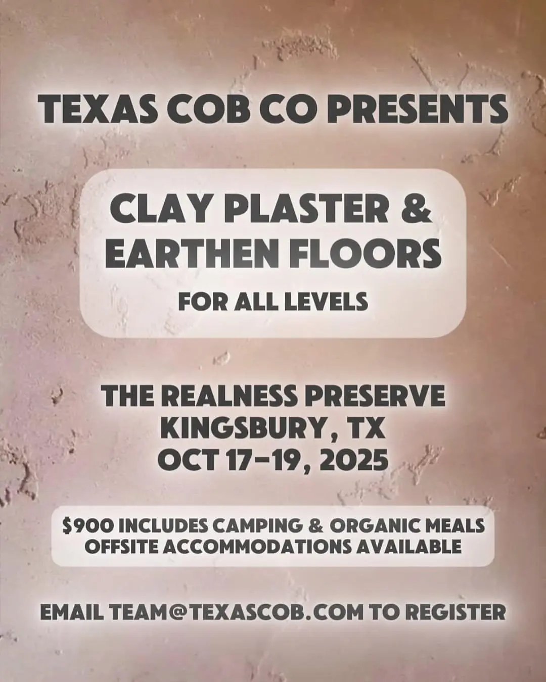 This comprehensive 3-day workshop teaches traditional and modern natural building techniques including clay plaster and earthen floors. The workshop includes camping, organic meals, and hands-on experience with natural materials in the beautiful setting of The Realness Preserve.